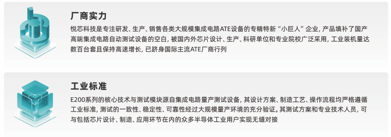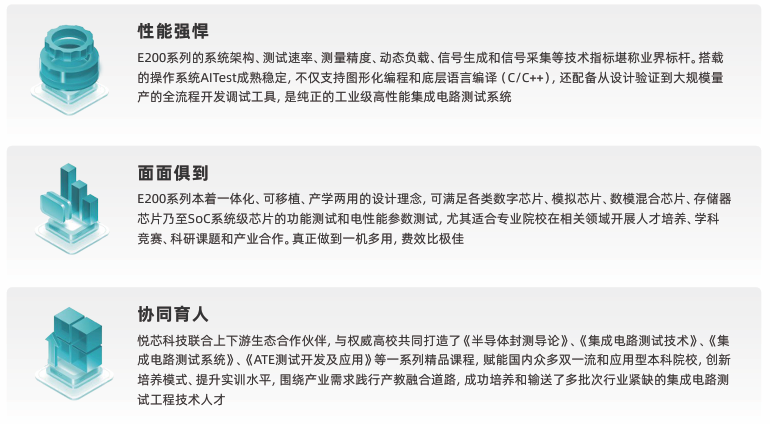 E200高性能集成電路工程測(cè)試系統(tǒng)系列產(chǎn)品是國(guó)內(nèi)領(lǐng)先的大規(guī)模集成電路測(cè)試設(shè)備廠商——悅芯科技基于公司在業(yè)內(nèi)廣泛使用的SOC測(cè)試設(shè)備T800和存儲(chǔ)器測(cè)試設(shè)備TM8000基礎(chǔ)上研制的,可滿足各類數(shù)字芯片、模擬芯片、數(shù)?;旌闲酒?、存儲(chǔ)器芯片乃至SoC系統(tǒng)級(jí)芯片的功能測(cè)試和電性能參數(shù)測(cè)試,是一款廣泛用于集成電路教學(xué)實(shí)訓(xùn)、設(shè)計(jì)驗(yàn)證、工程測(cè)試、 小批量產(chǎn)的高性能國(guó)產(chǎn)集成電路自動(dòng)測(cè)試設(shè)備(ATE),其優(yōu)異的技術(shù)指標(biāo)和強(qiáng)大的工業(yè)級(jí)應(yīng)用模塊達(dá)到國(guó)際水準(zhǔn),國(guó)內(nèi)顯著領(lǐng)先。