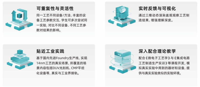集成電路制造虛擬仿真軟件依托真實的14nm、12英寸晶圓工藝制造產(chǎn)線,利用3D虛擬仿真現(xiàn)實技術,按照實際生產(chǎn)要求將集成電路的抽象原理和復雜、昂貴生產(chǎn)設備進行仿真,采用可視化、可交互的方式開發(fā)出集成電路制造工藝虛擬仿真實驗。