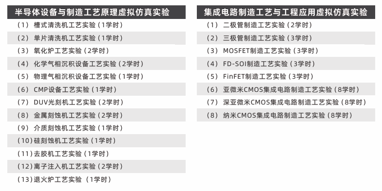 提供半導體設備與制造工藝原理、集成電路制造工藝與工程應用兩大類實驗。經(jīng)過本平臺的訓練,學生能以Foundry工藝工程師的身份,熟練完成晶圓制造全部工藝操作流程,掌握每種器件制造所用設備的操作技能。 本平臺還包括學生用實驗指導書、教師用教輔材料、視頻、實訓考核題等實訓資源,幫助老師和學生更好地完成實訓。平臺能夠記錄學生的操作,并給學生打分,完成實訓過程考核。