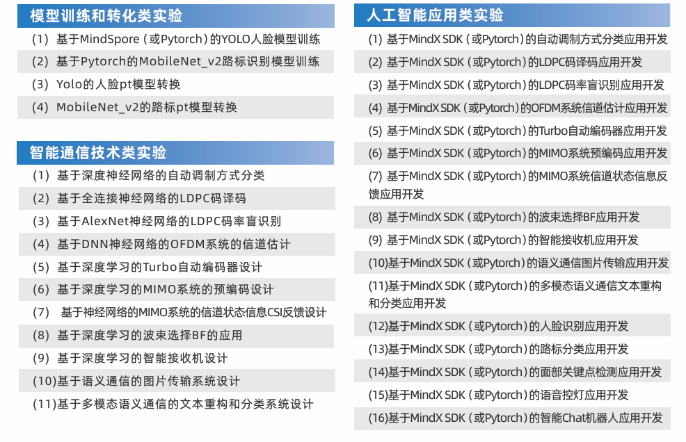 提供基于MindSpore或Pytorch框架的模型訓(xùn)練和轉(zhuǎn)化、智能通信技術(shù)、人工智能應(yīng)用等方向的實(shí)驗(yàn)案例,以支持 《智能通信》、《現(xiàn)代移動(dòng)通信》、《人工智能導(dǎo)論》、《深度學(xué)習(xí)與神經(jīng)網(wǎng)絡(luò)》、《嵌入式智能系統(tǒng)》等課程的課程實(shí)驗(yàn)與課程設(shè)計(jì),以及智能通信綜合設(shè)計(jì)、畢業(yè)設(shè)計(jì)等綜合應(yīng)用。