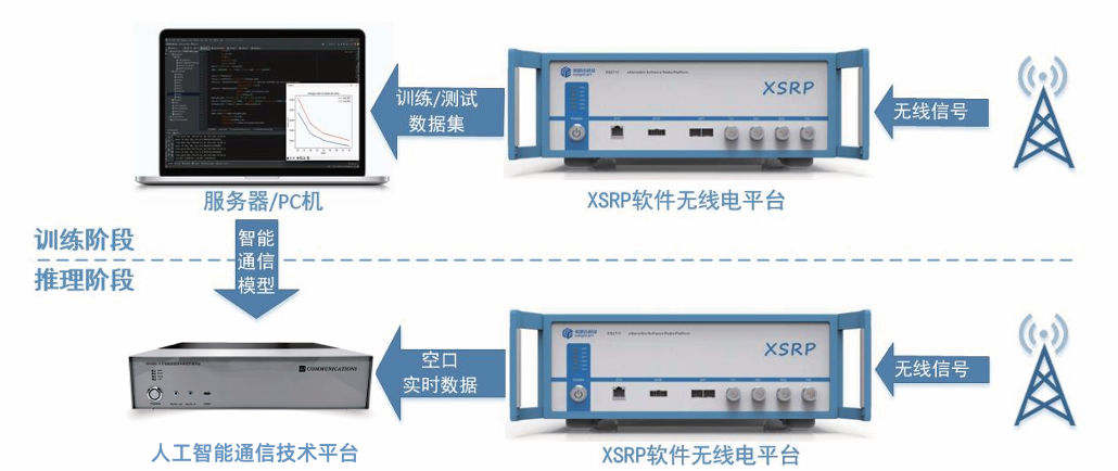 在訓(xùn)練階段,軟件無線電平臺(tái)將接收機(jī)接收到的空口無線信號(hào)轉(zhuǎn)換為基帶數(shù)據(jù),作為訓(xùn)練/測試數(shù)據(jù)發(fā)送給服務(wù)器 /PC機(jī),對設(shè)計(jì)好的智能通信AI算法和模型進(jìn)行訓(xùn)練、測試和優(yōu)化。并通過相應(yīng)的工具鏈,將訓(xùn)練好的模型進(jìn)行適配并部署到人工智能通信技術(shù)平臺(tái)。