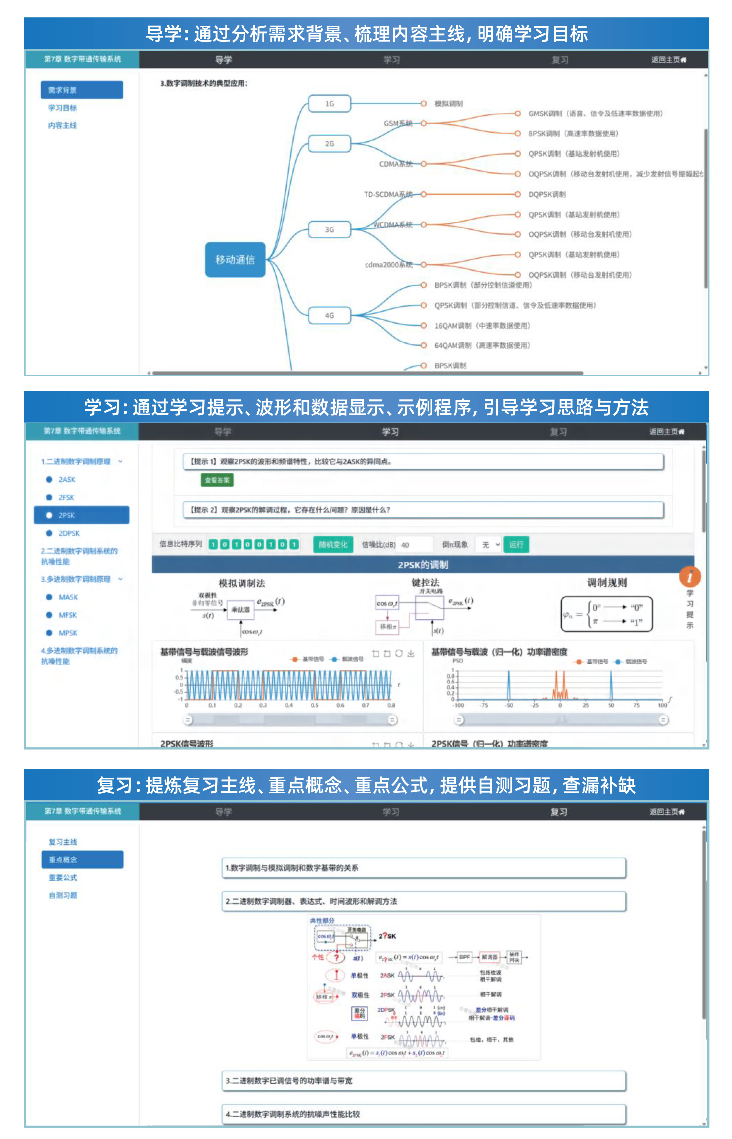 學(xué)習(xí)部分:指導(dǎo)教學(xué)策略,引導(dǎo)學(xué)習(xí)思路與方法:利用軟件交互性靈活的優(yōu)點,將靜態(tài)公式動態(tài)化、參數(shù)化,用戶可配置可交互,生動展示課程的重點和難點;通過實時仿真方式將難以理解的公式推導(dǎo)轉(zhuǎn)化為生動的波形和數(shù)據(jù)顯示,并可以實時改變參數(shù)查看波形和數(shù)據(jù)變化,深入淺出地展示理論知識;重難點知識點均提供了學(xué)習(xí)提示,學(xué)生可根據(jù)學(xué)習(xí)提示,跟隨教學(xué)名師指導(dǎo)的思路方法進行學(xué)習(xí),從而提高學(xué)習(xí)效率;提供MATLAB示例程序,讓學(xué)生從抽象的理論知識進入到仿真實現(xiàn)的 環(huán)節(jié),加深對理論知識的理解和掌握。