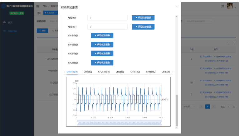 學(xué) 生:實驗項目選擇、在線填寫實驗報告、實驗報告上傳、自動讀取硬件設(shè)備波形、實驗指導(dǎo)書瀏覽與下載、實驗報告模板下載、統(tǒng)計分析