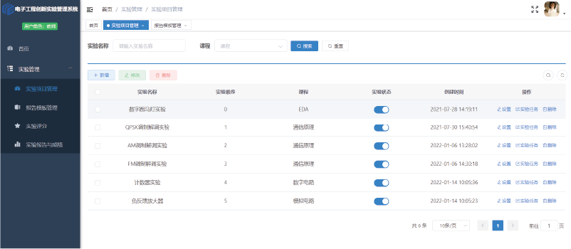 電子信息實驗管理軟件面向?qū)嶒灥男畔⒒椭悄芑芾恚凑諏嶒炚n程、實驗項目、實驗內(nèi)容的劃分方式,對一門課程的多個實驗項目,以及每個實驗項目下面的多個實驗內(nèi)容進(jìn)行全流程管理,可實現(xiàn)老師線上布 置實驗內(nèi)容,下載實驗報告,批閱實驗報告,對實驗報告進(jìn)查重;學(xué)生在實驗前預(yù)習(xí)實驗內(nèi)容、實驗中填寫實 驗數(shù)據(jù)、實驗后提交實驗報告,可一鍵生成實驗報告。本軟件可以和Dubhe電子工程創(chuàng)新實驗平臺配合,實現(xiàn)自 動讀取示波器數(shù)據(jù),自動顯示波形,自動填入實驗報告等功能。