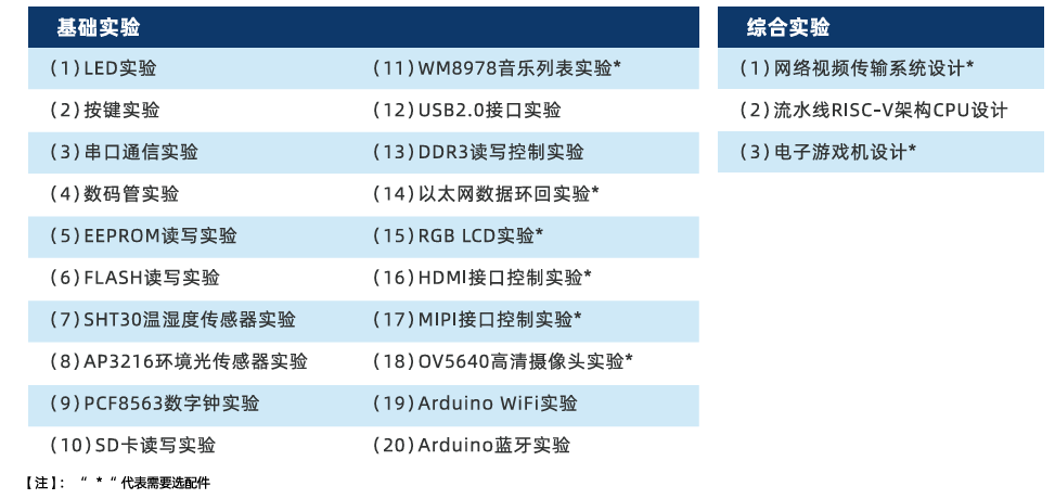 PocKet Lab-F3 FPGA開(kāi)發(fā)套件實(shí)驗(yàn)例程包括基礎(chǔ)實(shí)驗(yàn)和綜合實(shí)驗(yàn)兩部分構(gòu)成,其中基礎(chǔ)實(shí)驗(yàn)包括FPGA通用I0的使用、常用接口和外設(shè)的調(diào)用等20個(gè)實(shí)驗(yàn),綜合實(shí)驗(yàn)包括網(wǎng)絡(luò)視頻傳輸系統(tǒng)設(shè)計(jì)、流水線RISC-V架構(gòu)CPU設(shè)計(jì)、電子游戲機(jī)設(shè)計(jì)等3個(gè),具體如下: