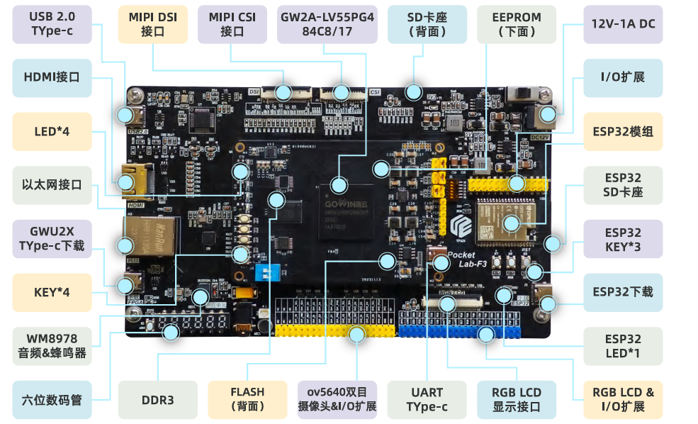 Pocket Lab-F3 FPGA開(kāi)發(fā)套件,核心器件FPGA選用高云半導(dǎo)體 GW2A-LV55PG484C8/17芯片
