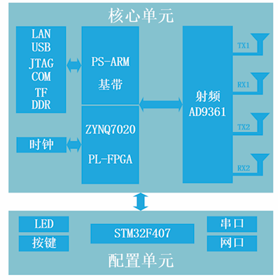 核心單元主要由基帶處理和射頻處理兩部分組成。射頻處理部分主芯片為AD9361,主要完成射頻前端放大、濾波等 處理,并完成射頻信號與零中頻數字信號之間的轉換?;鶐幚聿糠种餍酒瑸閄ilinx Zynq-7020,雙核Cortex-A9融合 ARTIX-7 FPGA,完成對基帶信號進行邏輯及應用的實時處理,也可將信號送入PC端進行基帶信號的實時信號分析、算法 仿真與功能實現。